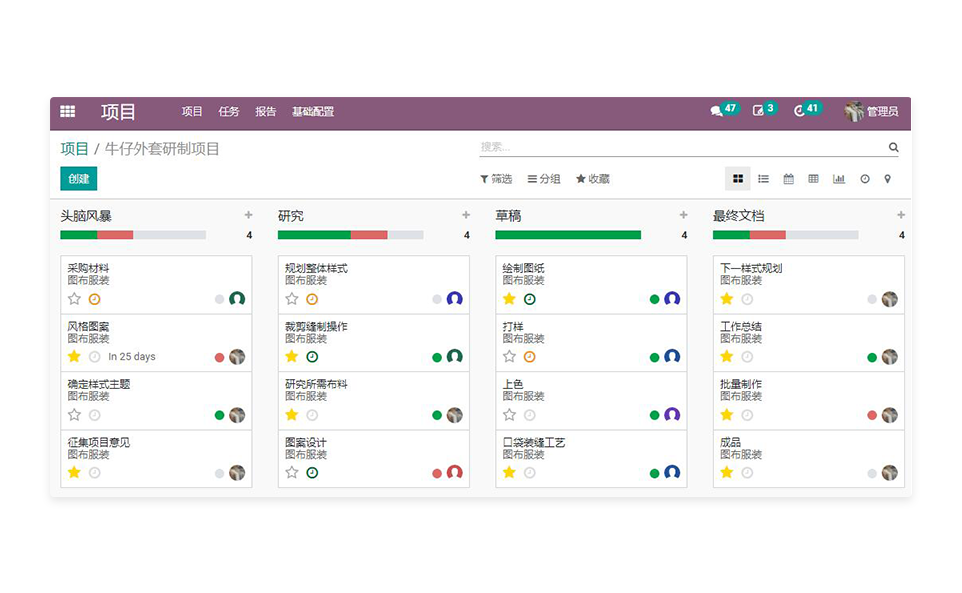 自定义添加列来配置项目阶段, 根据工作需要合理分配任务,并可设置优先级,组织日常活动,通过按钮操作通知同事工作等。
