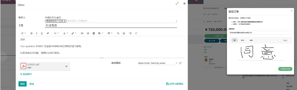 业务员在报价单创建完成后可通过EMALL发送客户进行确认,客户通过邮件链接可以进行一键签署,支持手写、印刷体、上传图片等多种方式进行确认。