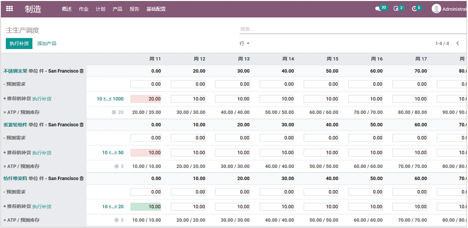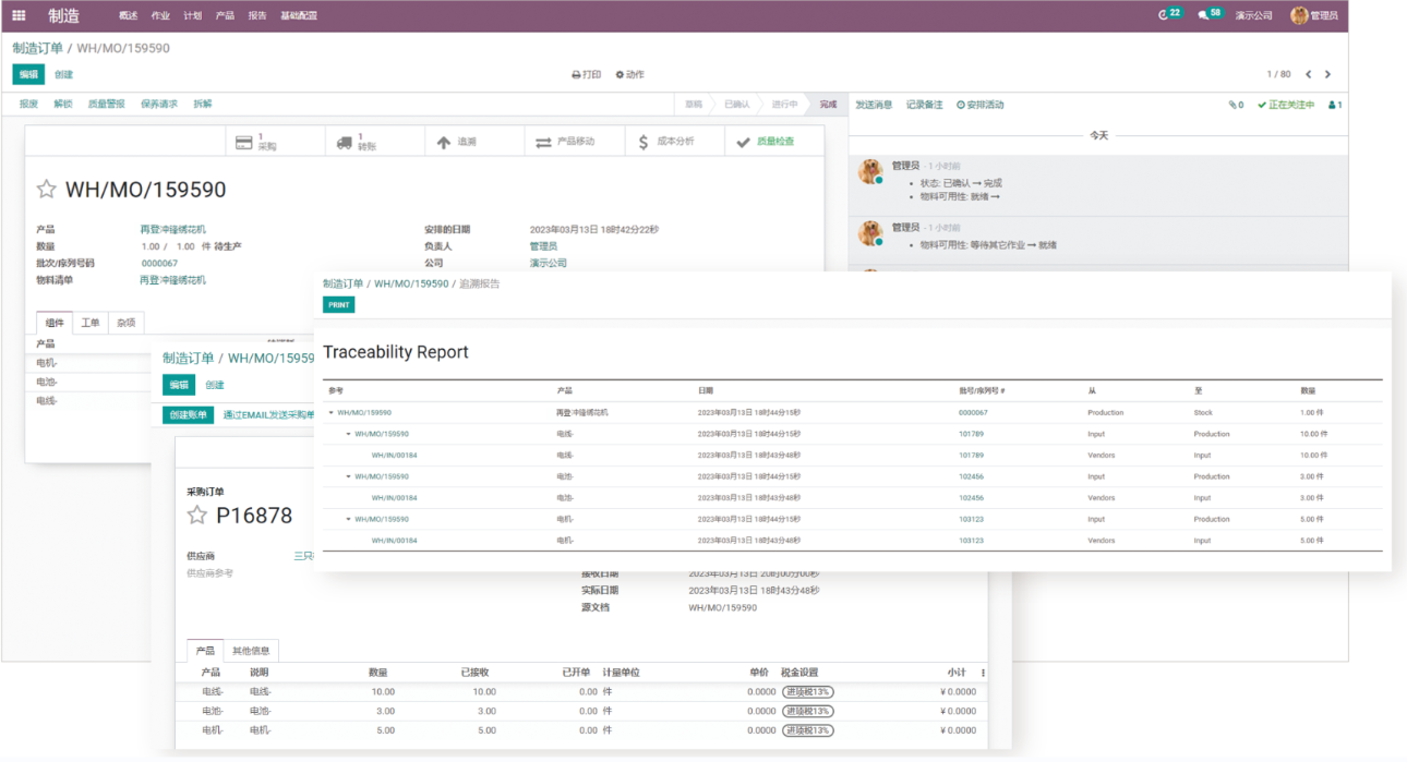 制造模块包括制造订单、整体设备效率、工单这三类报表,实时控制生产率,支持创建自定义统计面板,以便实时监控绩效。