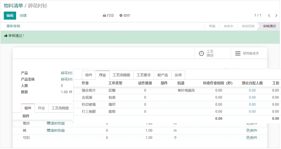 添加生产该产品所需要用到的物料信息,以及后续生产环节中需要使用到的工序作业信息。为生产部门工艺编写提供参考。